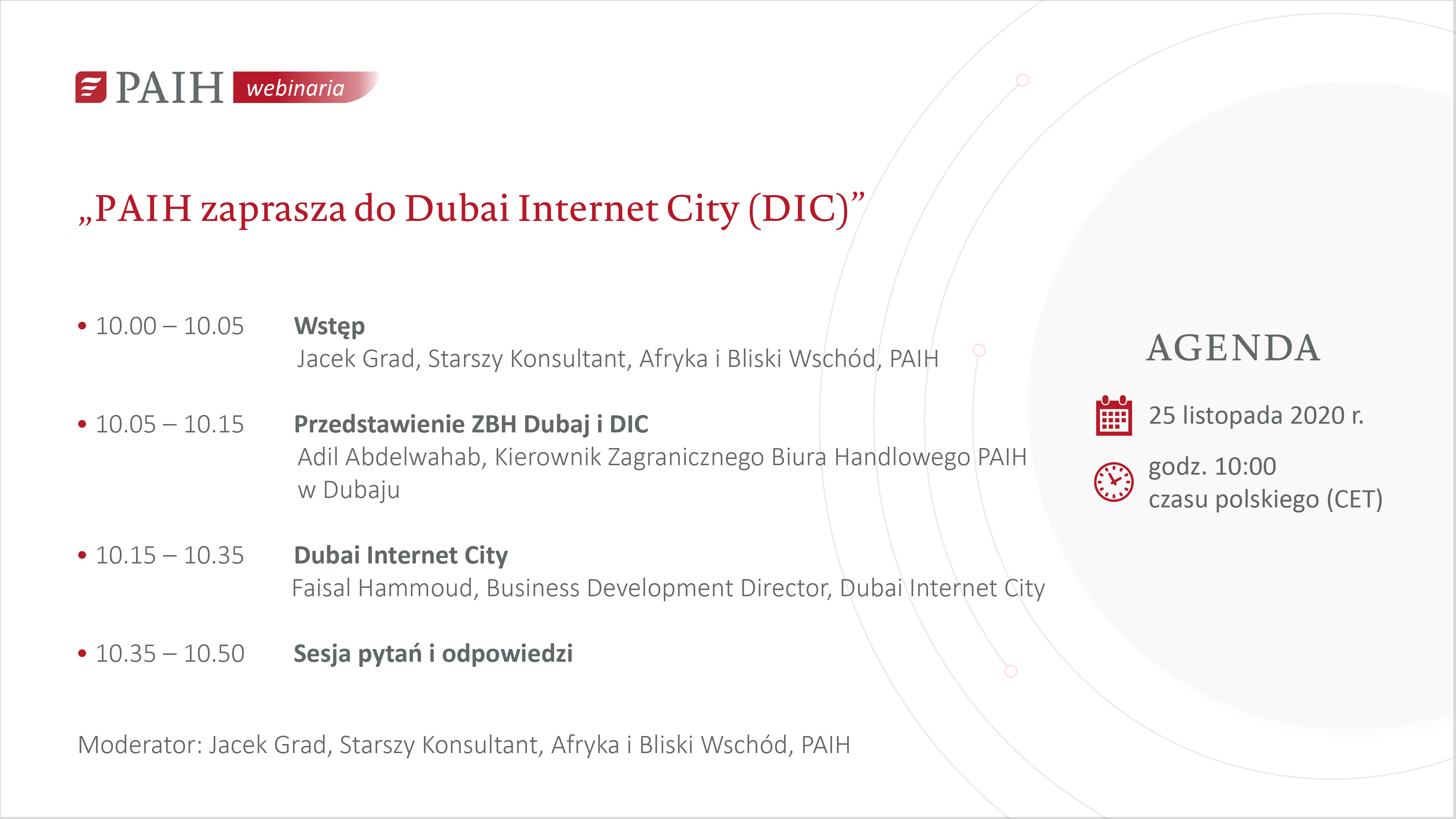 Spotkanie z DIC to szansa na zapoznanie z najnowszymi trendami oraz potrzebami rynku emirackiego i przybliżenie warunków panujących w strefie. W trakcie wydarzenia uczestnicy będą mieli szansę zadawania pytań w sesji Q&A, a po jego zakończeniu możliwość nadesłania swojego zgłoszenia do DIC.