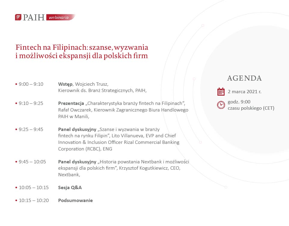 Jeśli chcesz dowiedzieć się jak wykorzystać potencjał Filipin oraz jak dołączyć do polskich firm fintech-owych już działających na rynku, zapisz się do udziału w naszym bezpłatnym webinarium, podczas którego poznasz: