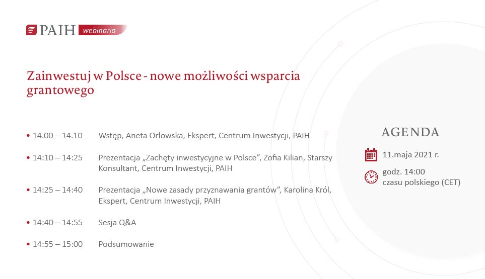 Eksperci PAIH opowiedzą zarówno o instrumentach funkcjonujących już na polskim rynku, jak i znowelizowanych zasadach "Programu wspierania inwestycji o istotnym znaczeniu dla gospodarki polskiej na lata 2011-2030", które ułatwiają otrzymanie wsparcia.