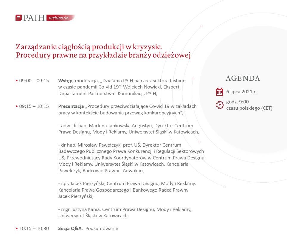 Opracowana publikacja autorstwa adw. dr hab. Marleny Jankowskiej, prof. UŚ, rp.r. dra hab. Mirosława Pawełczyka, prof. UŚ, r. pr. Jacka Pierzyńskiego oraz mgr Justyny Kani "Zarządzanie ciągłością produkcji w kryzysie. Procedury prawne na przykładzie branży odzieżowej" Katowice 2021, pomaga zrozumieć wyzwania z jakimi zmagały się przedsiębiorstwa w czasie najsilniejszej fazy pandemii, a także rzeczywistość post pandemiczną. Autorzy raportu wskazują na zasadność i korzyści płynące z opracowania i wdrażania procedur przeciwcovidowych aktualne dla wszystkich sektorów produkcyjnych. Polska Agencja Inwestycji i Handlu jest Patronem publikacji.