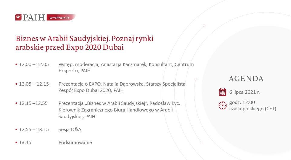 Webinarium "Biznes w Arabii Saudyjskiej. Poznaj rynki arabskie przed Expo 2020 Dubai" jest częścią cyklu wydarzeń online dla przedsiębiorców rozważających ekspansję na rynki Bliskiego Wschodu i Afryki. Spotkania są częścią programu gospodarczego towarzyszącego udziałowi Polski w Wystawie Światowej Expo 2020 w Dubaju.