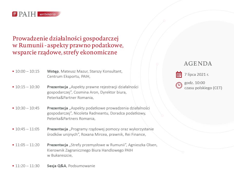 Korzystne warunki podatkowe (PIT i CIT - 16%, podatek obrotowy - 1-3%, VAT - 5%-19%), strategiczne położenie w UE, duże podobieństwa kulturowe i biznesowe oraz bardzo pozytywny wizerunek Polski to tylko niektóre z wielu atutów, które sprawiają, ze Rumunia jest bardzo atrakcyjnym krajem do ekspansji zagranicznej i rozpoczęcia działalności gospodarczej dla polskich inwestorów.