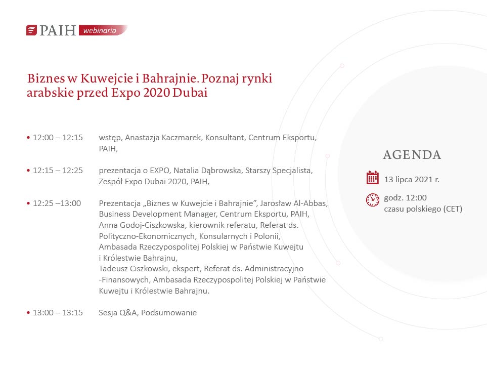 Webinarium "Biznes w Kuwejcie i Bahrajnie. Poznaj rynki arabskie przed Expo 2020 Dubai" jest częścią cyklu wydarzeń online dla przedsiębiorców rozważających ekspansję na rynki Bliskiego Wschodu i Afryki. Spotkania są częścią programu gospodarczego towarzyszącego udziałowi Polski w Wystawie Światowej Expo 2020 w Dubaju.