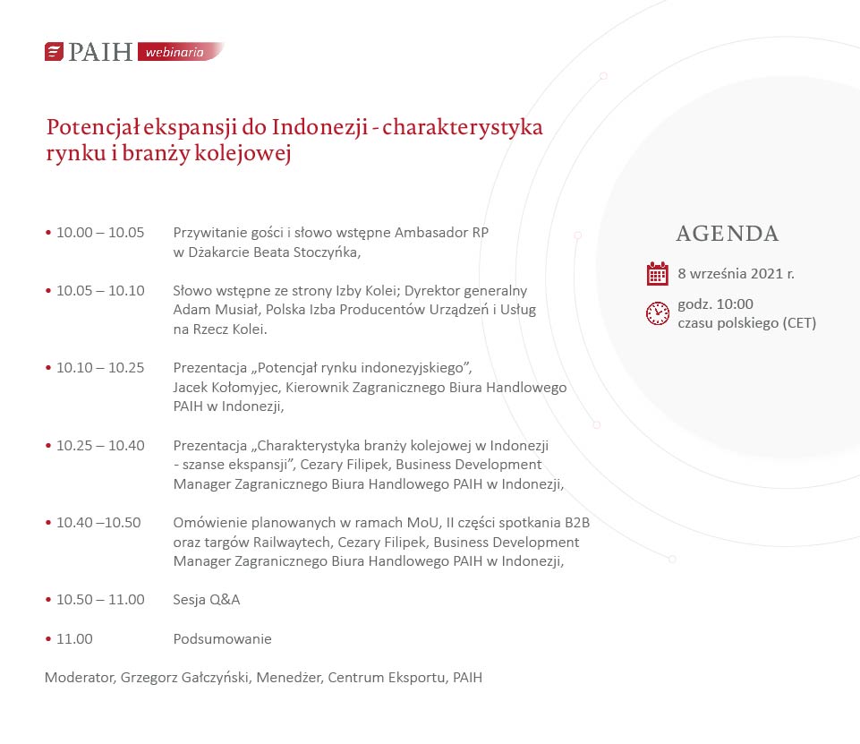 - dowiesz się dlaczego Indonezja jest jednym z najważniejszych destynacji dla polskiego przedsiębiorcy w branży kolejowej,