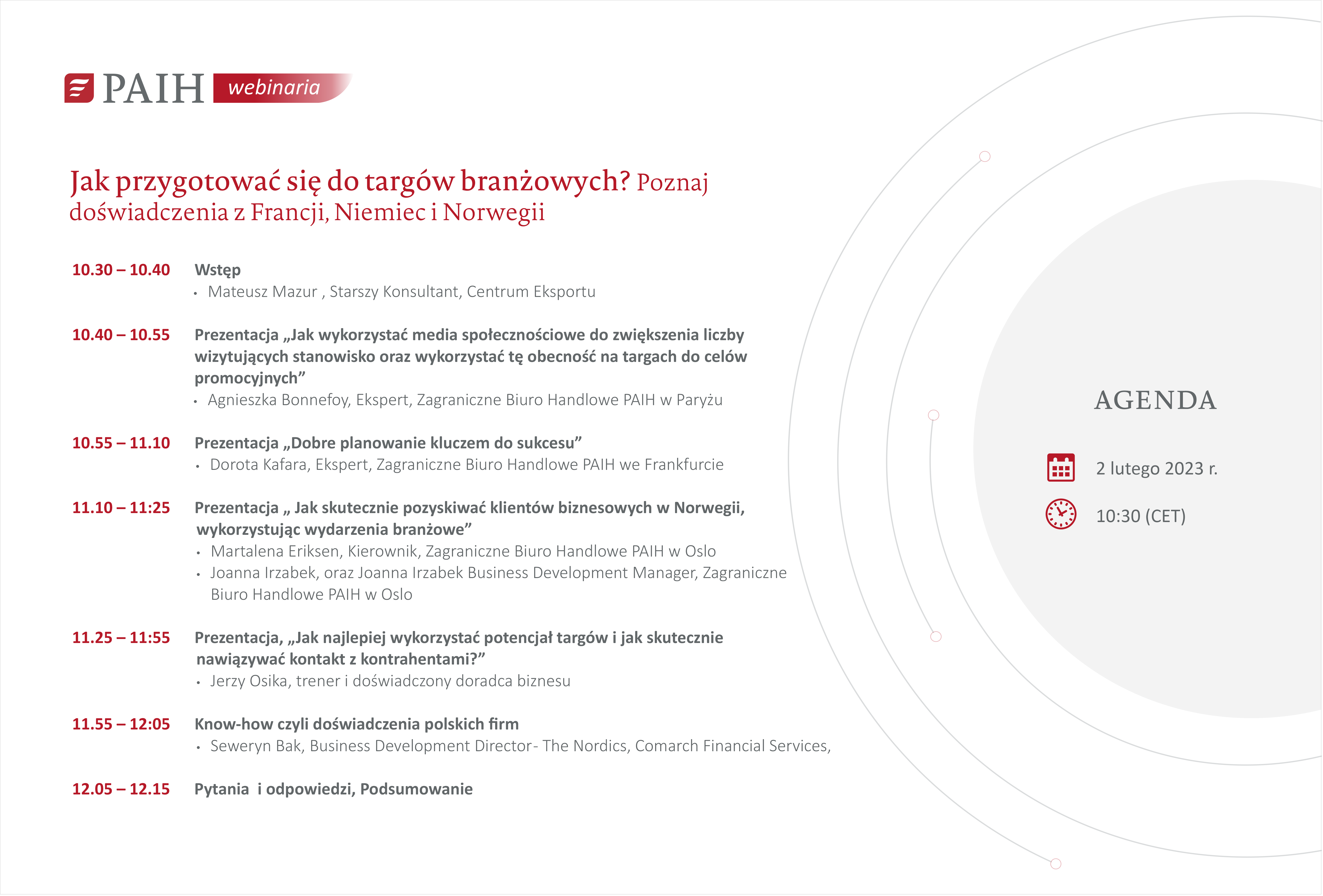 Udział w wydarzeniach wystawienniczych to szansa na zaprezentowanie oferty szerszej publiczności i nawiązanie obiecujących kontaktów biznesowych. Obecność na wiodących targach branżowych może być więc kluczowa dla budowania marki i pozycji handlowej. Wiele zależy od sektora, w jakim działamy i rynku, na który chcemy wejść. Zapraszamy do udziału w webinarium, którego prelegenci wyjaśnią, jak najlepiej przygotować się do wyjazdu na wydarzenia wystawiennicze we Francji, Niemczech i Norwegii.